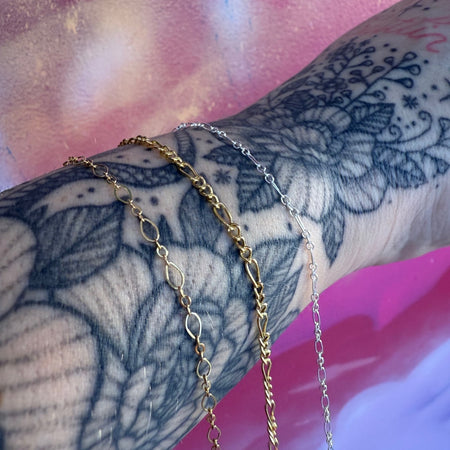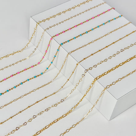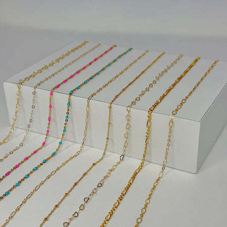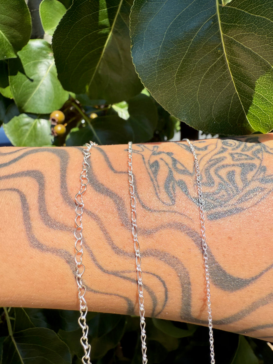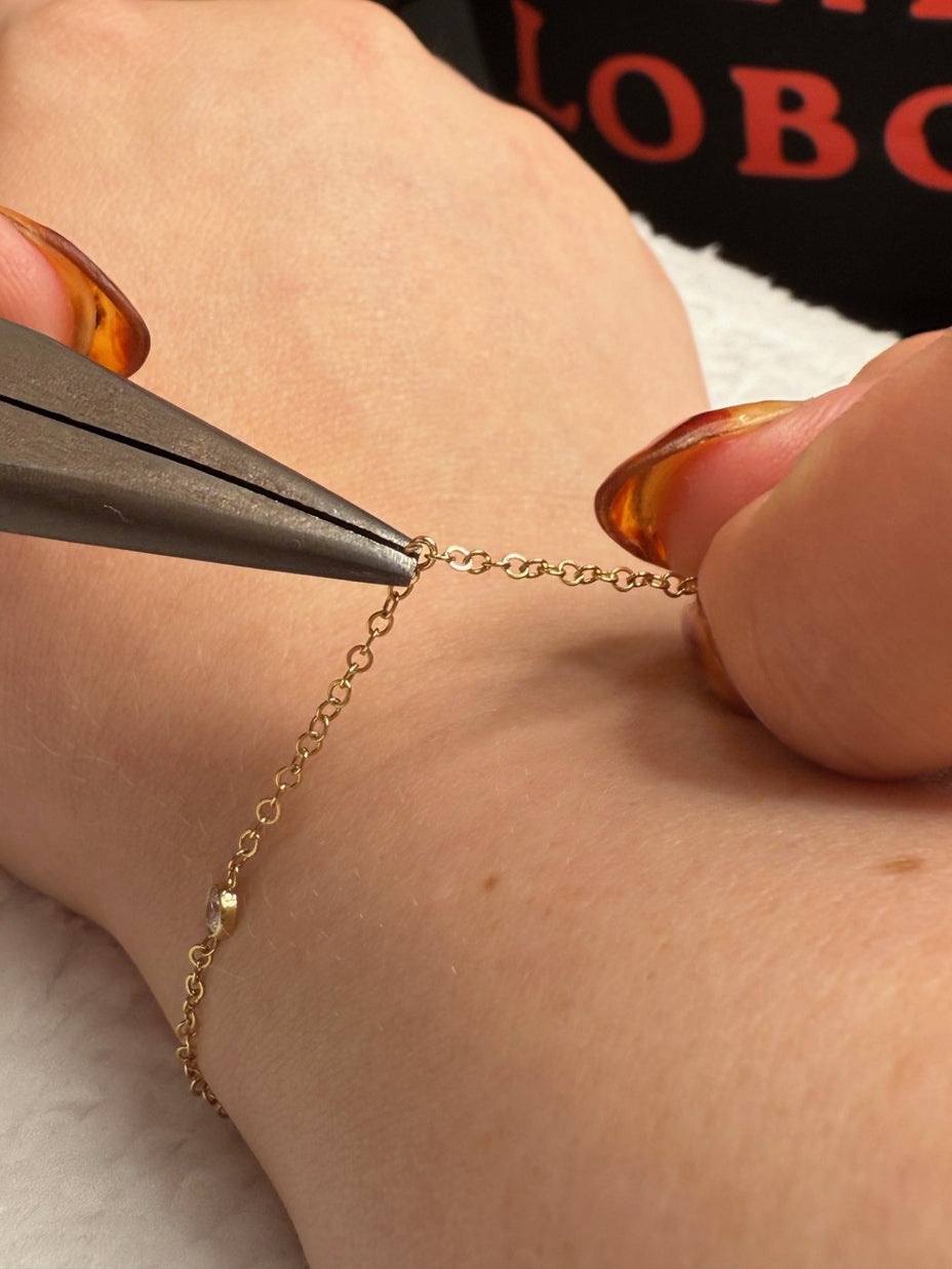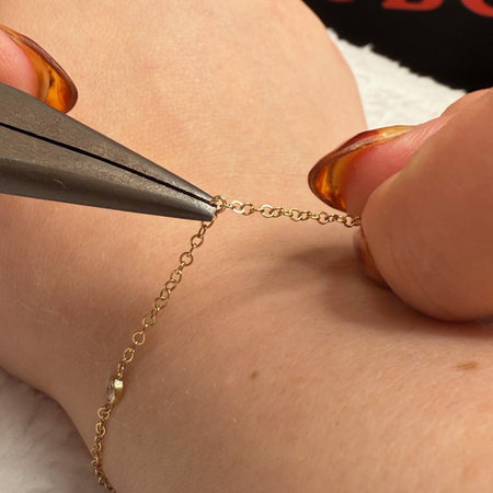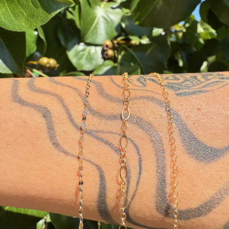 Our chains are available in three quality materials – Sterling Silver, 14k Rose and Yellow Gold Filled and 14k Rose, Yellow and White Solid Gold. Each piece entirely customisable with genuine stone connectors and charms. Measured to fit perfectly every time and soldered shut to create a clasp-free, delicate piece of jewellery. Whether it’s a symbol of love or loss, a milestone or it’s just because you deserve it, we ensure each piece is fitted with care, love and precision. Necklaces, bracelets, anklets, hand chains and belly chains available.